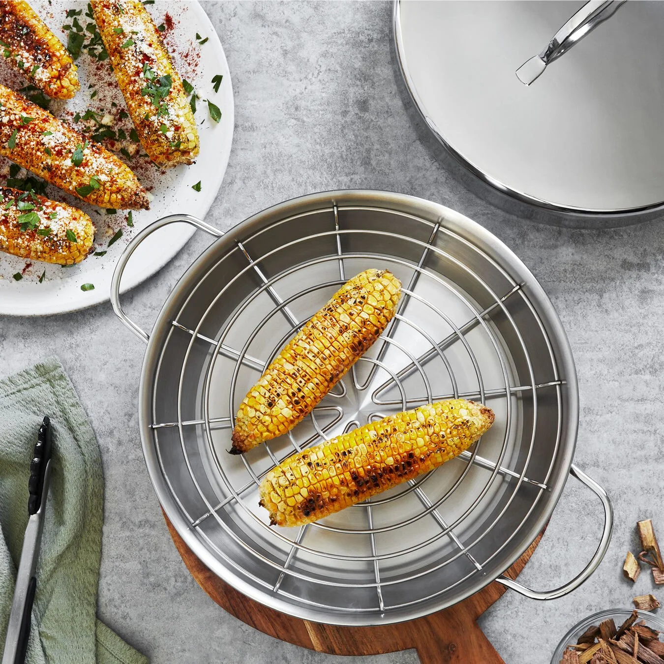 Il set da affumicatura della linea Specialties ha un diametro di 28 cm e fornisce tutto il necessario per aggiungere uno speciale aroma al pesce, alla carne, ai frutti di mare e al pollame. È sufficiente che i trucioli di legno vengano distribuiti sulla base della pentola e che il cibo da affumicare sia disposto sulla griglia. In questo modo potrete gustare il tipico aroma affumicato. Tutte le parti del set da affumicatura sono realizzate in acciaio inossidabile di prima qualità, che non arrugginisce e si mantiene facilmente. La base a 3 strati assicura un mantenimento e una dispersione uniformi del calore durante il processo di affumicatura ad alta temperatura. La pentola per affumicatura è adatta a tutti i tipi di fornelli, compresi i piani a induzione, e può essere utilizzata anche per cuocere le verdure al vapore. Usate questa attrezzatura per preparare un antipasto di trota affumicata che delizierà i vostri ospiti. Nella vostra cucina non dovrebbe mancare questa eccezionale pentola di Demeyere.