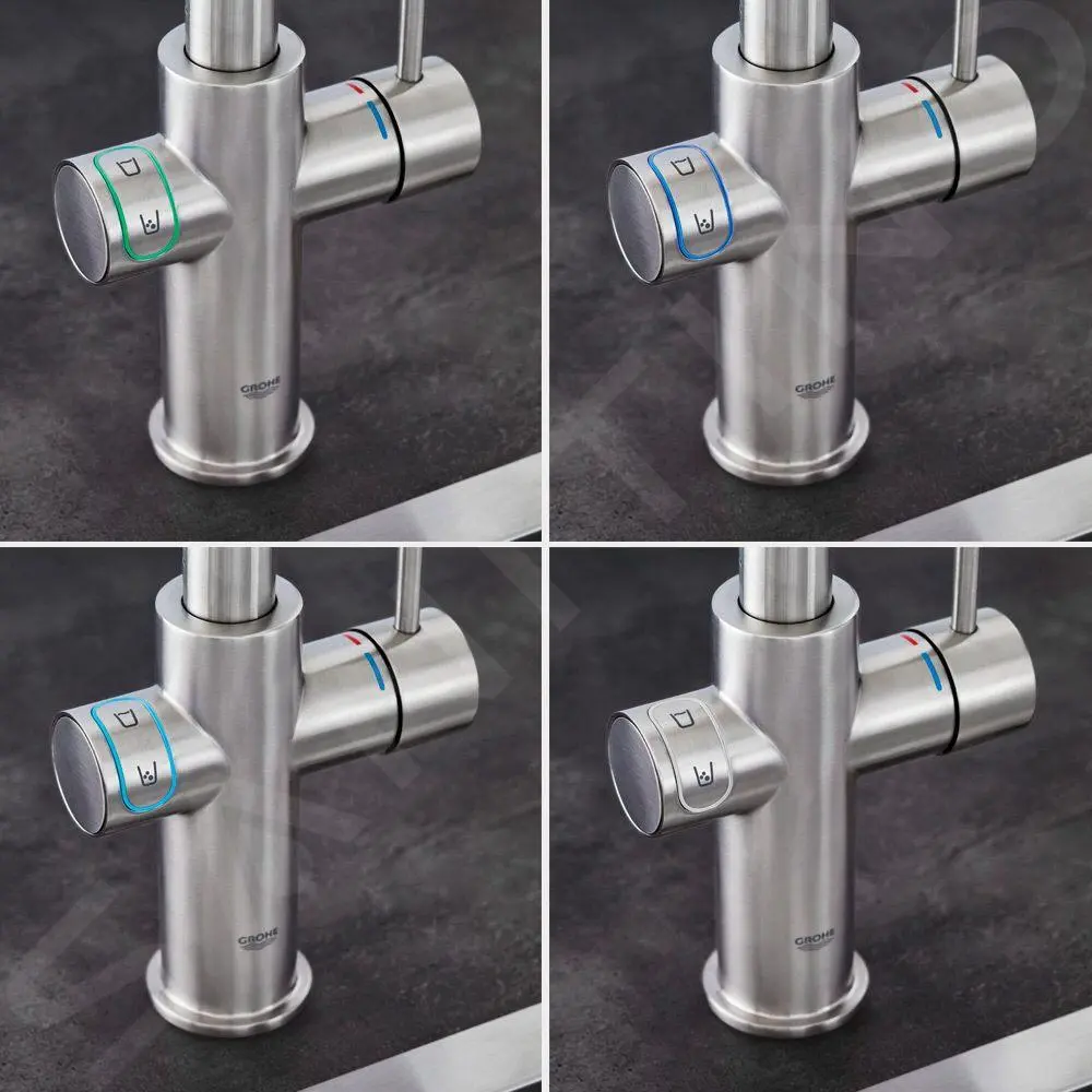 Il rubinetto del lavabo colpisce anche per la sua lavorazione e una serie di funzioni pratiche. La bocca alta girevole a forma di “U” offre spazio sufficiente per lavorare nel lavello. La doccetta estraibile poi amplia le possibilitá di utilizzo. Le superfici lisce sono di facile pulizia grazie alla tecnologia GROHE StarLight, che conferisce loro resistenza meccanica e le protegge dal deposito di gocce d’acqua e sporco. Il controllo sensibile della leva é assicurato da una cartuccia in ceramica con tecnologia GROHE SilkMove. L’unitá di raffreddamento é in grado di fornire fino a 3 litri di acqua refrigerata all’ora, mentre é possibile posizionare il refrigeratore fino a 1,8 metri dal rubinetto. Potrete anche controllare il sistema di filtraggio e raffreddamento tramite l’applicazione GROHE Ondus. Fate entrare attrezzature moderne nella vostra cucina.