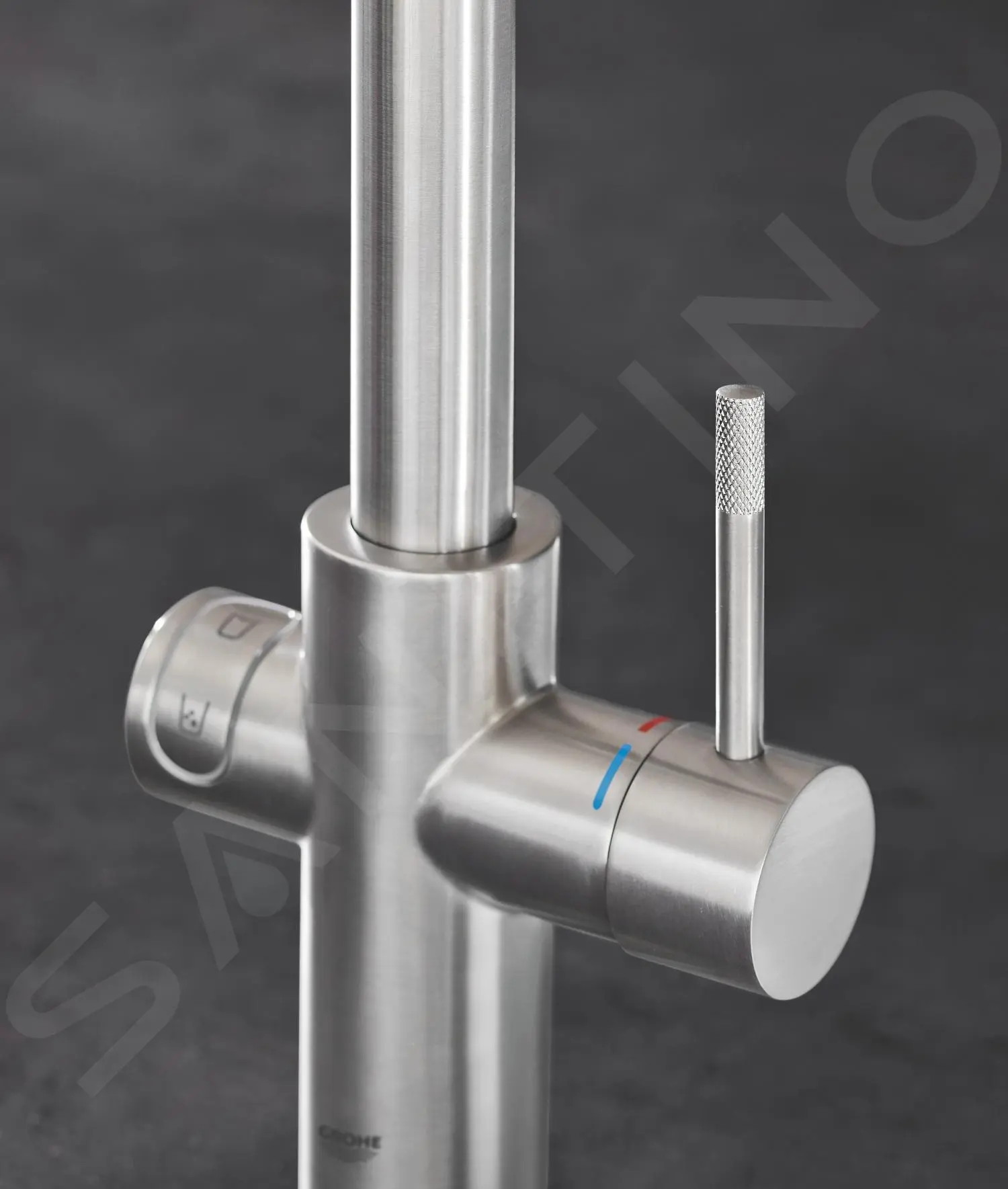 Il corpo elegante e liscio del miscelatore per lavello GROHEil quale ha una speciale qualitá che dá l´opportunitá di ottenere acqua purificata priva di sostanze indesiderate. All’interno del rubinetto troverete prese d’acqua separate. Mentre si utilizza la leva per controllare la normale acqua del rubinetto destinata al lavaggio dei piatti o al risciacquo degli alimenti, ruotando la maniglia sul lato sinistro del rubinetto otterrete acqua filtrata o refrigerata. Potrete scegliere tra gassata, gassata leggera o liscia. Bevande e pasti preparati con quest’acqua avranno un gusto piú raffinato e ne apprezzerete l’aroma piú pronunciato. Un bel vantaggio é che l’acqua filtrata avrá eliminata anche la sua durezza.