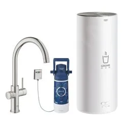 Miscelatore da cucina GROHE RED Duo (braccio di erogazione a forma di C) con set di filtraggio e caldaia di dimensione L per avere immediatamente l’acqua bollente. Finitura opaca in acciaio inox.