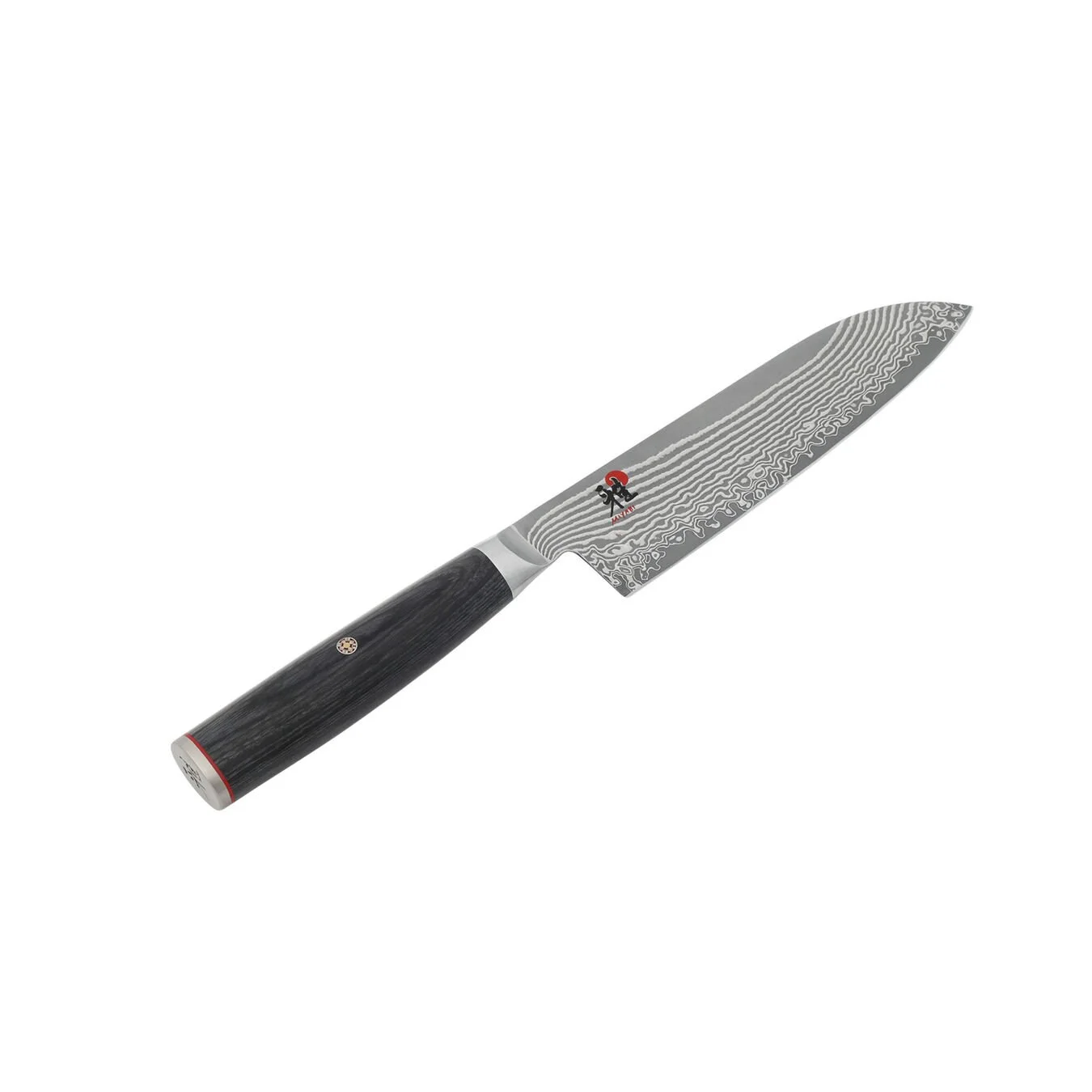 MIYABI 5000 FCD Santoku, lunghezza lama 18 cm. Questo coltello Santoku giapponese ha un’anima in acciaio duro al carburo, per un ottimo mantenimento del bordo di taglio e un’ottima affilatura. Santoku significa “Tre Virtù”, ovvero carne, pesce e verdure. Il tagliente piatto si presta a un movimento di taglio deciso piuttosto che al movimento oscillatorio dei coltelli da cuoco europei. Il nucleo della lama è avvolto da 48 strati esterni di acciaio, che formano l’esclusivo design damascato sulla lama. Il bordo di taglio è affilato simmetricamente con il processo Honbazuke (non a bisellatura singola), quindi può essere utilizzato sia dai mancini che dai destrorsi. Non c’è una protezione per le dita, quindi si può usare tutta la lunghezza del tagliente. L’impugnatura e il mezzo bullone si uniscono in una soluzione di continuità, per un utilizzo confortevole. La superficie liscia aiuta a prevenire la formazione di calli sul pollice e sull’indice. Lavare a mano e affilare a pietra. Consigliamo di utilizzare un tagliere in legno piuttosto che in vetro, ceramica o pietra, in quanto questi rendono opaco il bordo della lama.