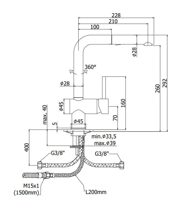 - 1 tubo flessibile di connessione in acciaio inox M15x1 per il tubo flessibile della doccia